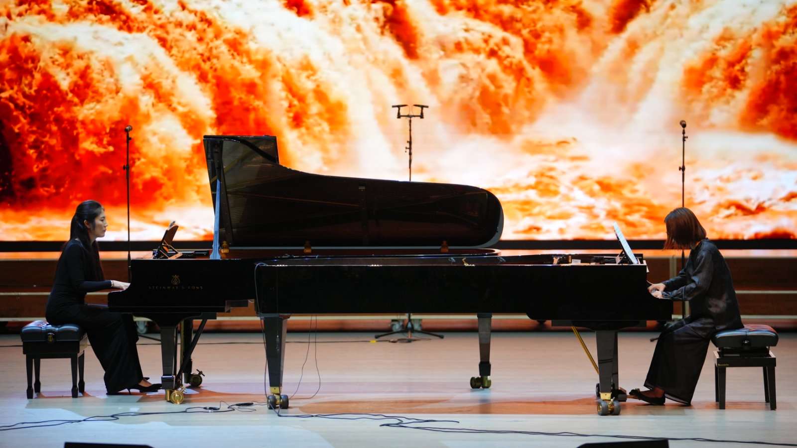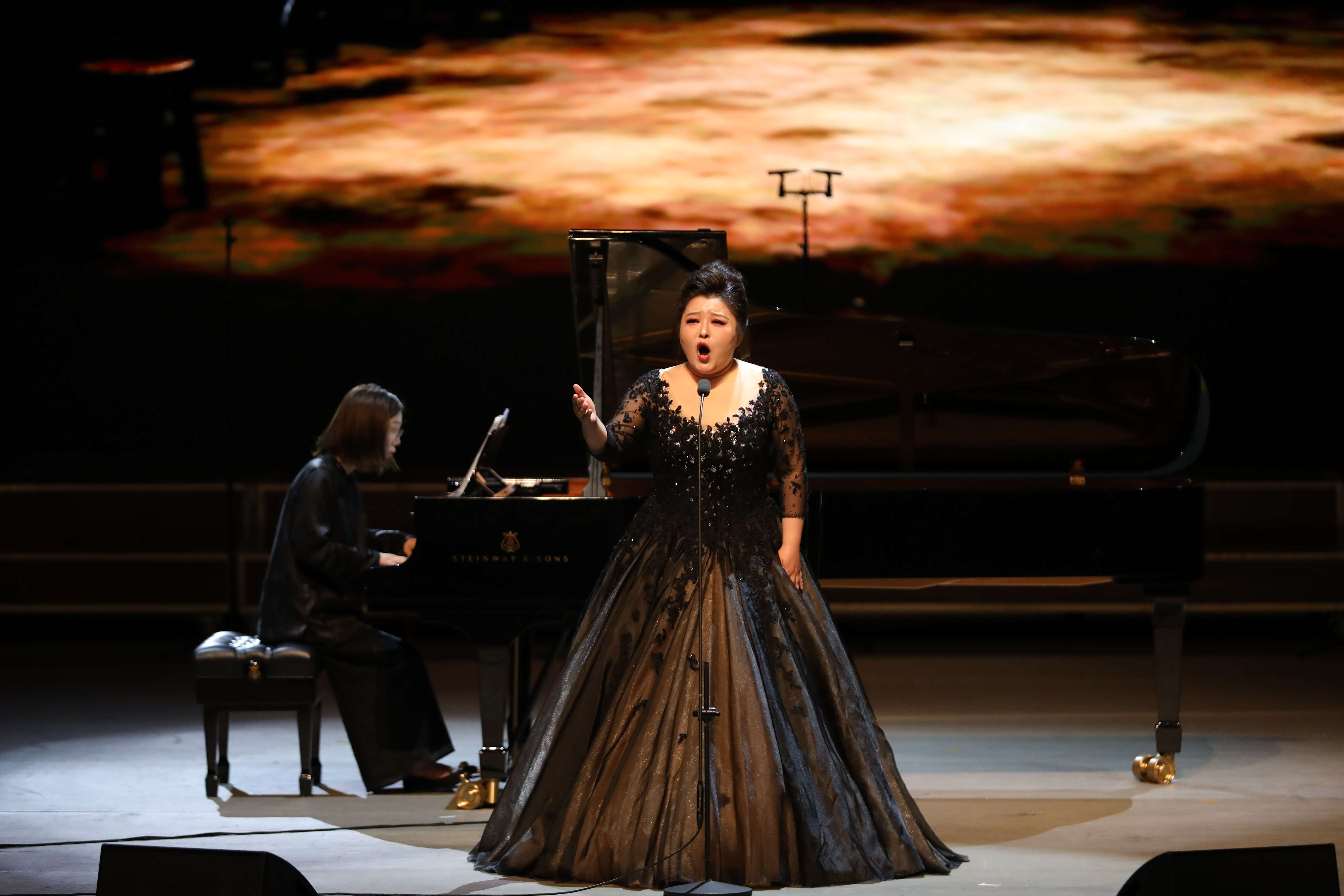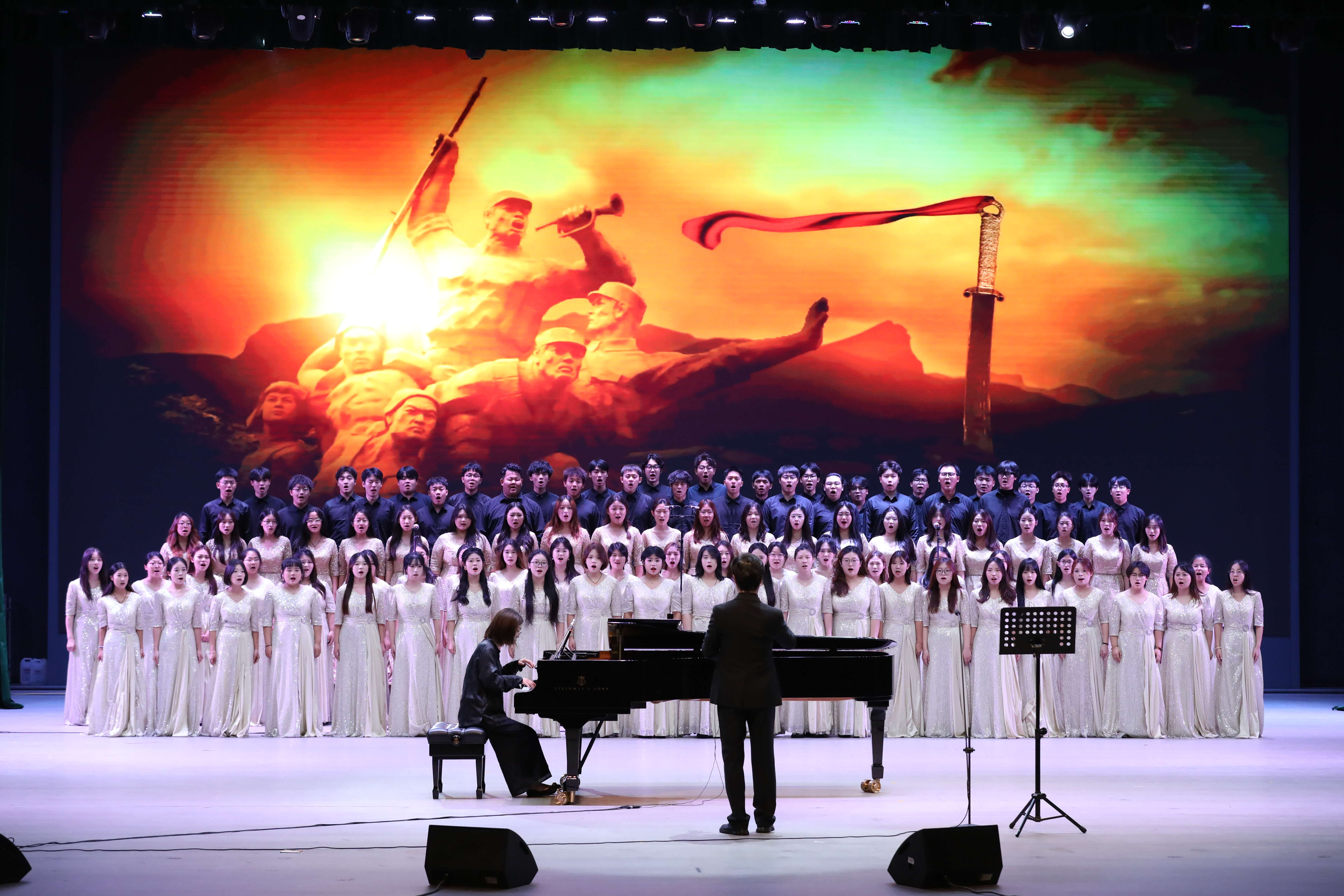 在第三篇章“精神灯塔,走向胜利”,两位在读博士教师于明洁、田畅带来的古筝合奏《山丹丹开花红艳艳》既有陕北民歌的浪漫风韵,又有整体旋律的张弛有度和疏密有致;青年博士教师郭旭带来女中音独唱《黄河怨》展现了中华民族顽强不屈、不畏强暴的抗争精神;青年博士教师令佳宁和刘司宁共同演奏的双钢琴协奏《黄河船夫曲》以急促的节奏呈现搏击风浪的战斗场面;青年博士教师雍茜、黄陈沙杨共同演的双钢琴协奏《黄河颂》意境开阔高远,气势磅礴,充满力量。全体演员共同演唱的《毕业歌》号召青年学子肩负时代使命,挺膺担当。